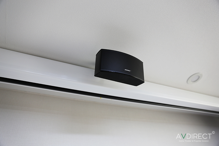 공간 환경에 맞는 설치를 해 드리고자 전면에 3개의 보스 큐브 스피커는 133인치 전동 스크린에 어떠한 피스(나사못)이나 스크린 프레임에 훼손 상처 없이도 별도 제작된 브라켓으로 스피커 3개를 부착해 드렸습니다.